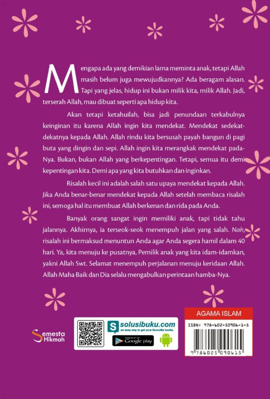 Ketika banyak pasangan berumah tangga yang sangat ingin memiliki anak, tapi tidak tahu jalannya. Akhirnya, ia terseok-seok menempuh jalan yang salah. Buku ini bermaksud menuntun Anda agar Anda para calon Ibu agar segera hamil dalam 40 hari. Ya, kita menuju ke pusatnya, Pemilik anak yang kita idam-idamkan, yakni Allah Swt. Selamat menempuh perjalanan menuju keridaan Allah. Allah Maha Baik dan Dia selalu mengabulkan permintaan hamba-Nya.
