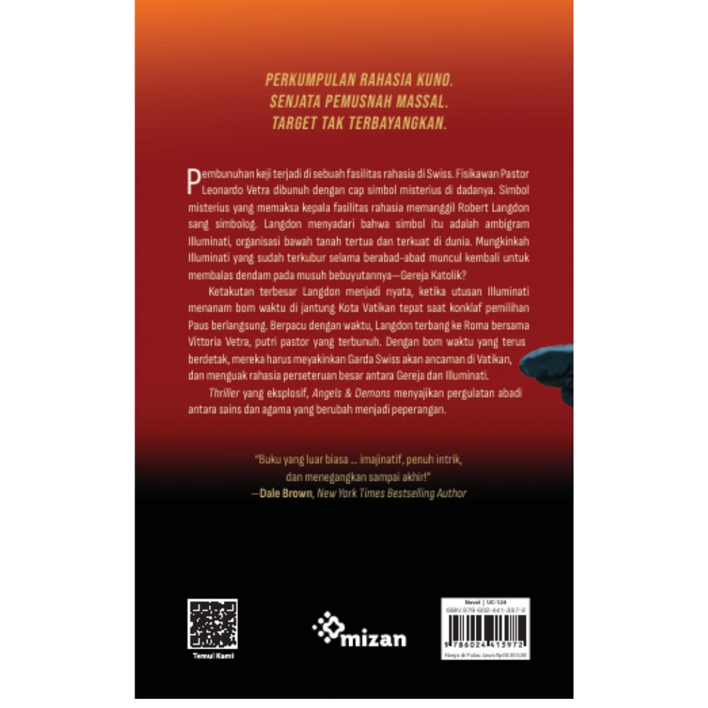 -Perkumpulan rahasia kuno. Senjata pemusnah massal. Target tak terbayangkan. Pembunuhan keji terjadi di sebuah fasilitas rahasia di Swiss. Fisikawan Pastor Leonardo Vetra dibunuh dengan cap simbol misterius di dadanya. Simbol misterius yang memaksa kepala fasilitas rahasia memanggil Robert Langdon sang simbolog. Langdon menyadari bahwa simbol itu adalah ambigram Illuminati, organisasi bawah tanah tertua dan terkuat di dunia. Mungkinkah Illuminati yang sudah terkubur selama berabad-abad muncul kembali untuk membalas dendam pada musuh bebuyutannya-Gereja Katolik? Ketakutan terbesar Langdon menjadi nyata, ketika utusan Illuminati menanam bom waktu di jantung Kota Vatikan tepat saat konklaf pemilihan Paus berlangsung. Berpacu dengan waktu, Langdon terbang ke Roma bersama Vittoria Vetra, putri pastor yang terbunuh. Dengan bom waktu yang terus berdetak, mereka harus meyakinkan Garda Swiss akan ancaman di Vatikan, dan menguak rahasia perseteruan besar antara Gereja dan Illuminati. Thriller yang eksplosif, Angels & Demons menyajikan pergulatan abadi antara sains dan agama yang berubah menjadi peperangan. ^Buku yang luar biasa … imajinatif, penuh intrik, dan menegangkan sampai akhir!^ -Dale Brown, New York Times Bestselling Author