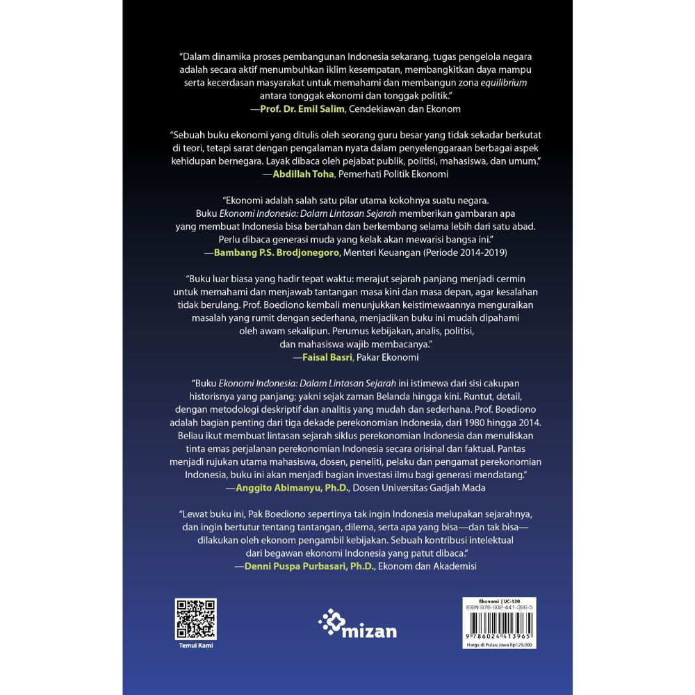 Buku ini mengulas perjalanan sejarah ekonomi Indonesia, sejak masa pra-VOC hingga pembahasan pilihan-pilihan ekonomi politik di masa krisis, dengan fokus masa setelah kemerdekaan sampai sekarang. Ditulis oleh ekonom ternama Indonesia yang berkecimpung langsung dalam pengambilan kebijakan selama puluhan tahun, pengalamannya tentu memberikan insight yang sangat berharga bagi siapa pun yang mencintai Indonesia.