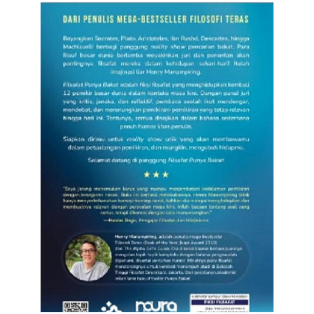 Bayangkan Socrates, Plato, Aristoteles, Ibn Rushd, Descartes, hingga Machiavelli berbagi panggung reality show pencarian bakat. Para filsuf besar dunia berlomba meyakinkan juri dan penonton akan pentingnya filsafat mereka dalam kehidupan sehari-hari! Itulah imajinasi liar Henry Manampiring (Penulis Mega-Bestseller Filosofi Teras).