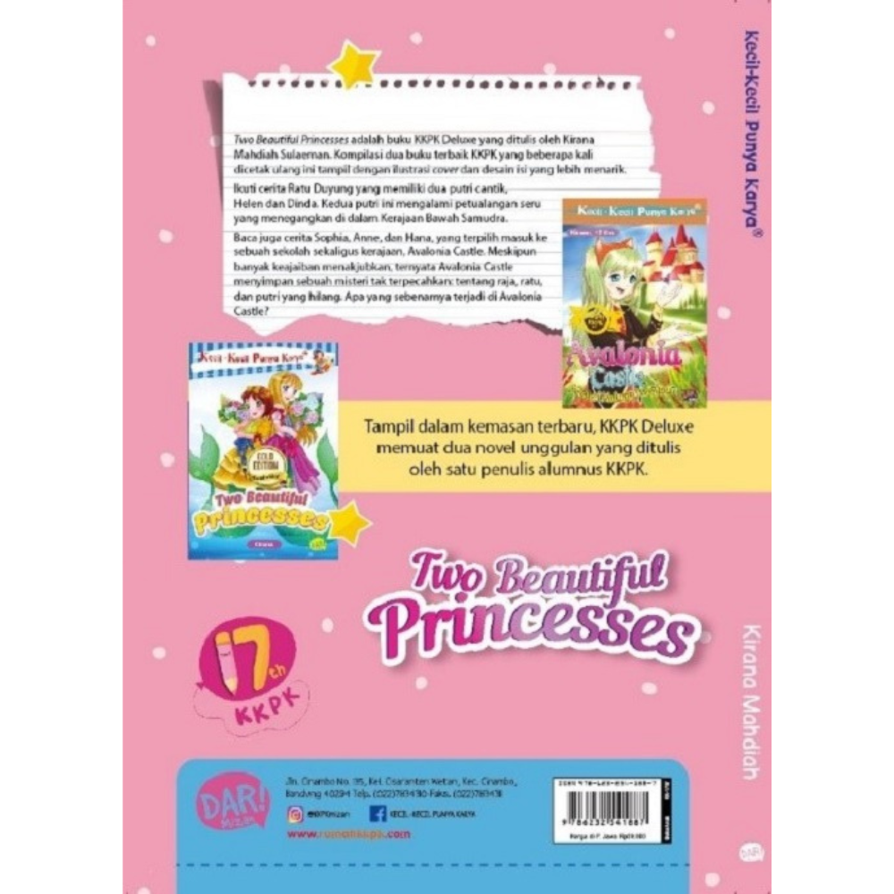 Two Beautiful Princesses adalah buku KKPK Deluxe yang ditulis oleh Kirana Mahdiah Sulaeman. Kompilasi dua buku terbaik KKPK yang beberapa kali dicetak ulang ini tampil dengan ilustrasi cover dan desain isi yang lebih menarik.