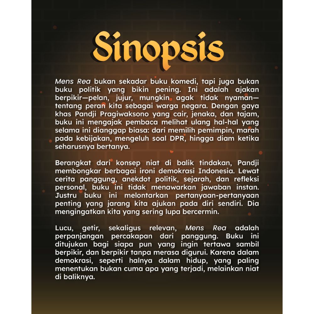 Mens Rea bukan sekadar buku komedi, tapi juga bukan buku politik yang bikin pening. Ini adalah ajakan berpikir—pelan, jujur, mungkin agak tidak nyaman—tentang peran kita sebagai warga negara. Dengan gaya khas Pandji Pragiwaksono yang cair, jenaka, dan tajam, buku ini mengajak pembaca melihat ulang hal-hal yang selama ini dianggap biasa: dari memilih pemimpin, marah pada kebijakan, mengeluh soal DPR, hingga diam ketika seharusnya bertanya.