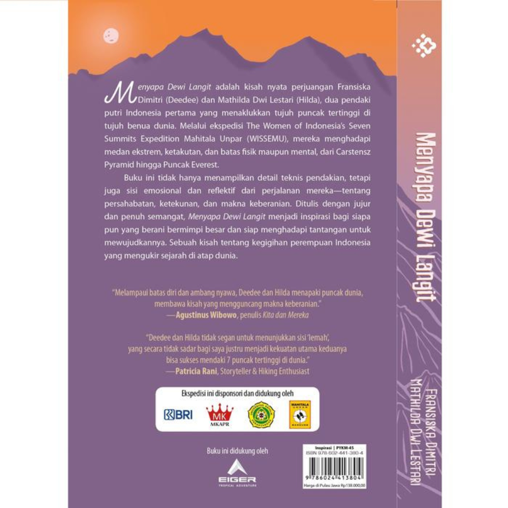 Buku ini tidak hanya menampilkan detail teknis pendakian, tetapi juga sisi emosional dan reflektif dari perjalanan mereka—tentang persahabatan, ketekunan, dan makna keberanian. Ditulis dengan jujur dan penuh semangat, Menyapa Dewi Langit menjadi inspirasi bagi siapa pun yang berani bermimpi besar dan siap menghadapi tantangan untuk mewujudkannya. Sebuah kisah tentang kegigihan perempuan Indonesia yang mengukir sejarah di atap dunia.