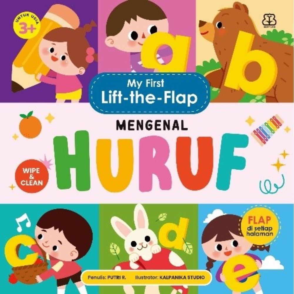 Buku ini berisi pengenal huruf a–z untuk anak usia 3–7 tahun. Setiap huruf dilengkapi dengan contoh objek yang diawali dengan huruf yang sedang dibahas. Contoh objek yang disajikan dilengkapi juga dengan kosakata bahasa Inggrisnya serta pemenggalan per suku kata dalam bahasa Indonesia untuk memudahkan anak belajar membaca. Selain itu, terdapat juga huruf dengan garis putus-putus yang dapat ditebalkan sebagai sarana latihan menulis huruf. Dengan fitur lift-the-flap, buku ini menghadirkan pengalaman belajar yang interaktif dan menyenangkan. Selain menjadi media belajar yang menyenangkan, buku ini juga bisa menjadi media bonding yang praktis dan terjangkau untuk orang tua dan anak.