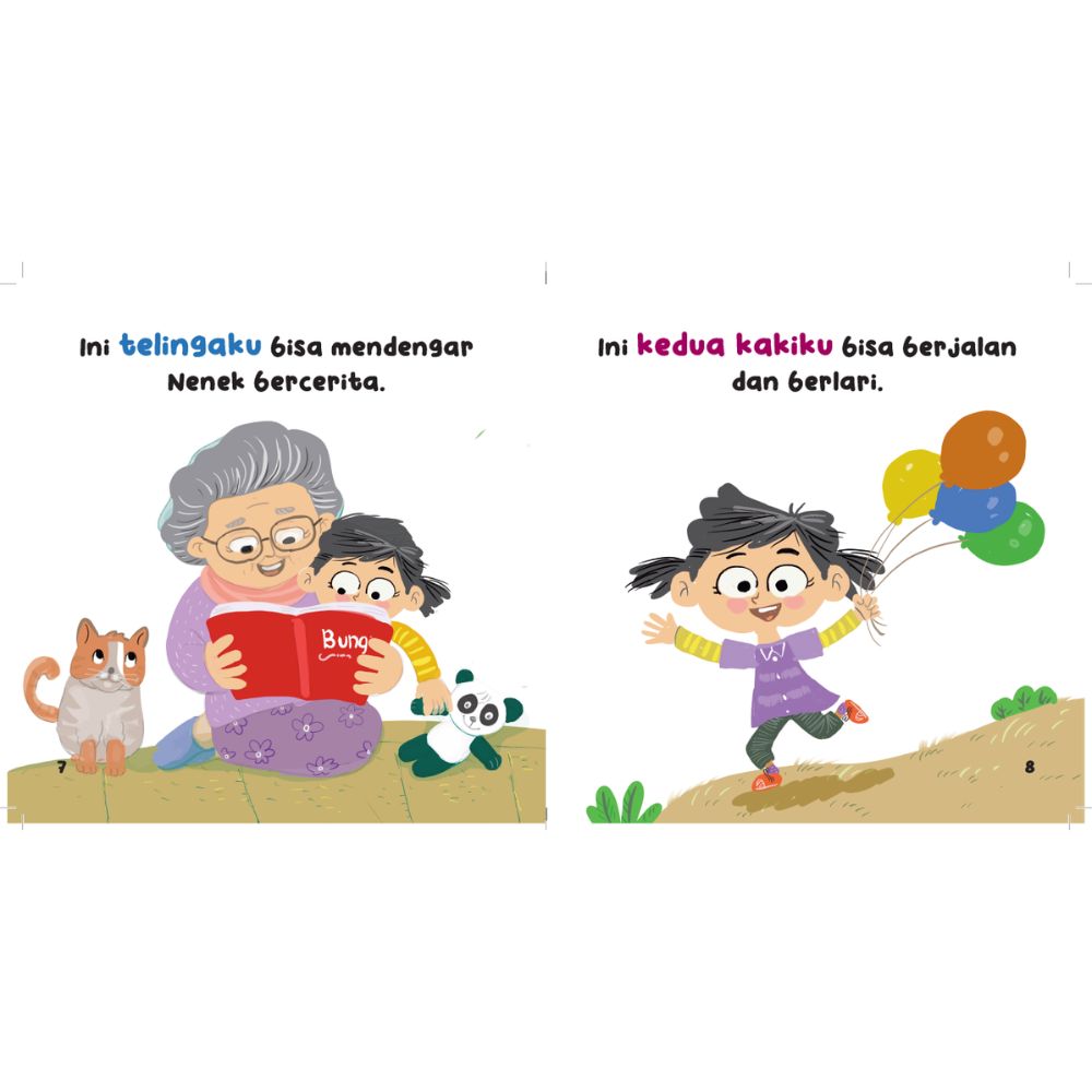 Buku ini membantu anak mengenal bagian tubuh dan fungsinya sambil menumbuhkan rasa syukur dan cinta pada diri sendiri.