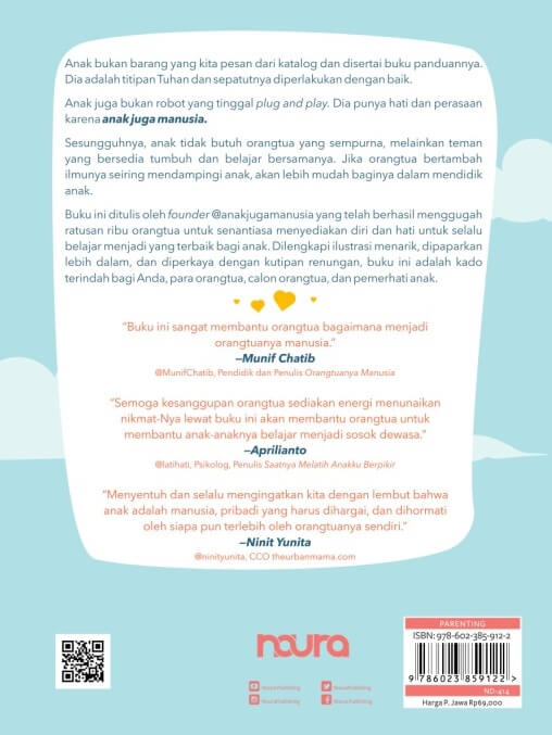 Buku ini ditulis oleh founder @anakjugamanusia yang telah berhasil menggugah ratusan ribu orangtua untuk senantiasa menyediakan diri dan hati untuk selalu belajar menjadi yang terbaik bagi anak. Dilengkapi ilustrasi menarik, dipaparkan lebih dalam, dan diperkaya dengan kutipan renungan, buku ini adalah kado terindah bagi Anda, para orangtua, calon orangtua, dan pemerhati anak.