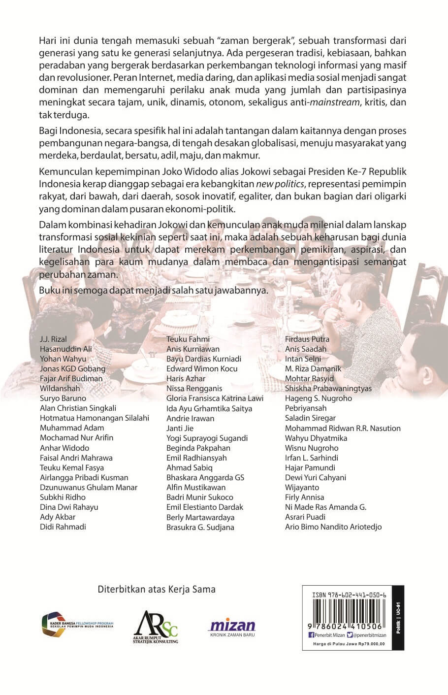 Hari ini dunia tengah memasuki sebuah ^zaman bergerak^, sebuah transformasi dari generasi yang satu ke generasi selanjutnya. Ada pergeseran tradisi, kebiasaan, bahkan peradaban yang bergerak berdasarkan perkembangan teknologi informasi yang masif dan revolusioner. Peran Internet, media daring, dan aplikasi media sosial menjadi sangat dominan dan memengaruhi perilaku anak muda yang jumlah dan partisipasinya meningkat secara tajam, unik, dinamis, otonom, sekaligus anti-mainstream, kritis, dan tak terduga. Bagi Indonesia, secara spesifik hal ini adalah tantangan dalam kaitannya dengan proses pembangunan negara-bangsa, di tengah desakan globalisasi, menuju masyarakat yang merdeka, berdaulat, bersatu, adil, maju, dan makmur. Kemunculan kepemimpinan Joko Widodo alias Jokowi sebagai Presiden Ke-7 Republik Indonesia kerap dianggap sebagai era kebangkitan new politics, representasi pemimpin rakyat, dari bawah, dari daerah, sosok inovatif, egaliter, dan bukan bagian dari oligarki yang dominan dalam pusaran ekonomi-politik. Dalam kombinasi kehadiran Jokowi dan kemunculan anak muda milenial dalam lanskap transformasi sosial kekinian seperti saat ini, maka adalah sebuah keharusan bagi dunia literatur Indonesia untuk dapat merekam perkembangan pemikiran, aspirasi, dan gegelisahan para kaum mudanya dalam membaca dan mengantisipasi semangat perubahan zaman. Buku ini semoga dapat menjadi salah satu jawabannya.