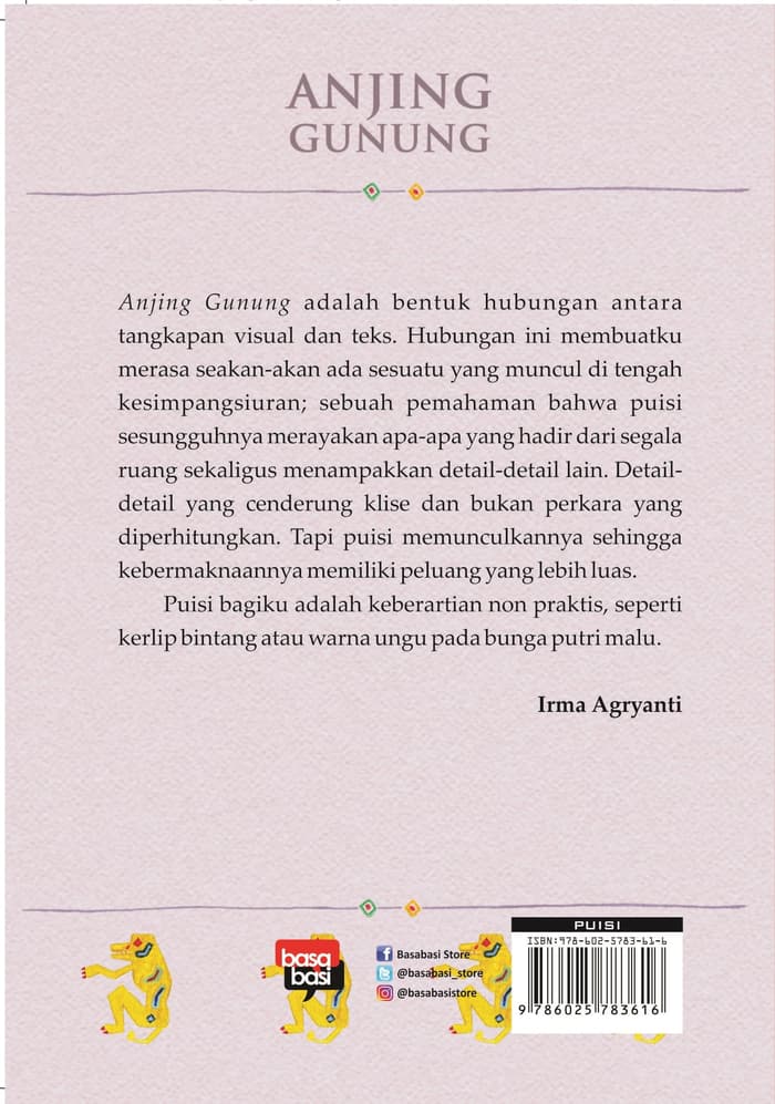 Anjing Gunung adalah bentuk hubungan antara tangkapan visual dan teks. Hubungan ini membuatku merasa seakan-akan ada sesuatu yang muncul di tengah kesimpangsiuran; sebuah pemahaman bahwa puisi sesungguhnya merayakan apa-apa yang hadir dari segala ruang sekaligus menampakkan detail-detail lain. Detail-detail yang cenderung klise dan bukan perkara yang diperhitungkan. Tapi puisi memunculkannya sehingga kebermaknaannya memiliki peluang yang lebih luas.