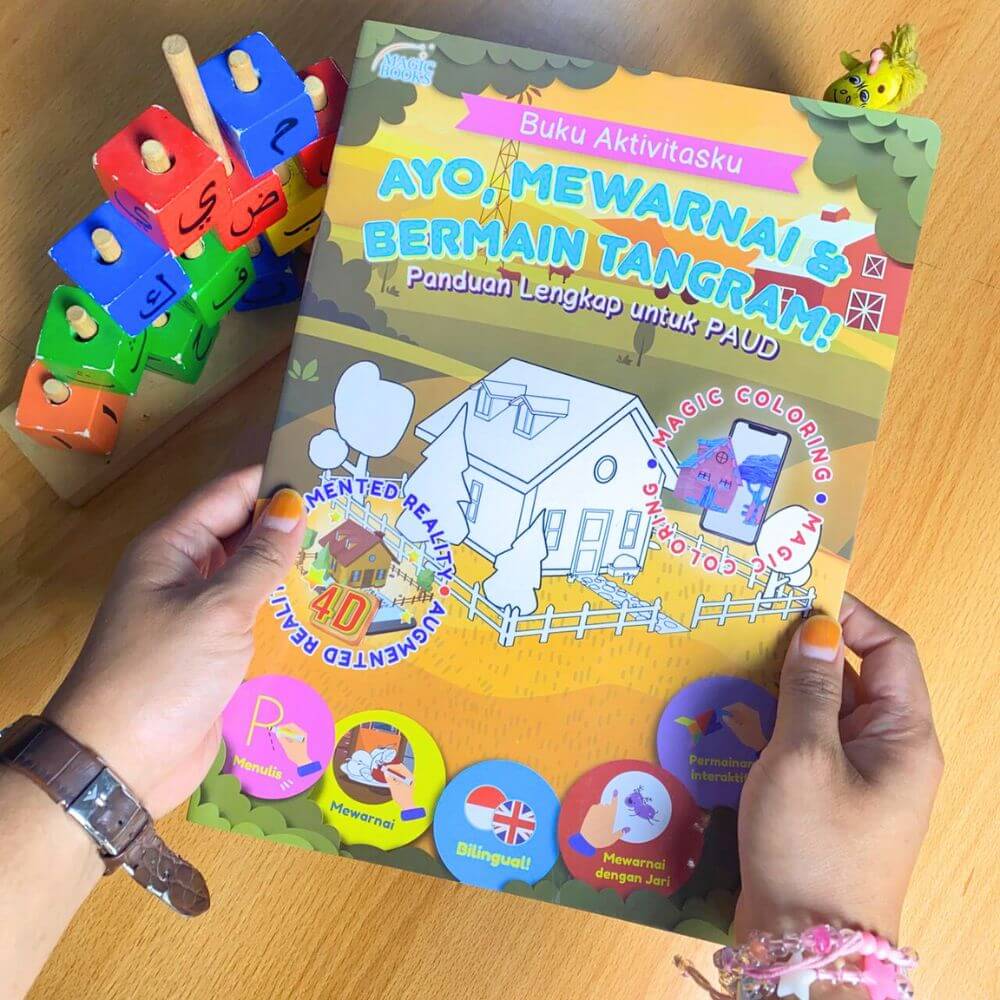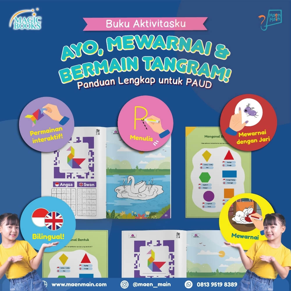 adalah buku aktivitas yang lengkap, mulai dari aktivitas mewarnai, menulis, membaca, mengenal warna, mengenal bentuk dan paling membedakan dari buku aktivitas lain yaitu permainan tangram yang bisa dimainkan bersama-sama.