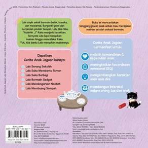 Lala asyik sekali bermain balok, boneka, dan mewarnai. Berganti-ganti dan berpindah-pindah tempat. Hingga tiba-tiba, “Aduhhh ...!” terdengar suara keras Raka dari ruang tamu. Astaga! Ternyata Lala lupa merapikan mainan hingga mencelakai Raka. Yuk, kita bantu Lala merapikan mainannya.