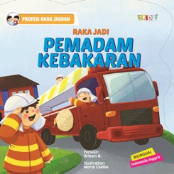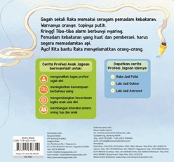 Gagah sekali Raka memakai seragam pemadam kebakaran. Warnanya oranye, topinya putih. Kringg! Tiba-tiba alarm berbunyi nyaring. Pemadam kebakaran yang kuat dan pemberani, harus segera memadamkan api. Ayo! Kita bantu Raka menyelamatkan orang-orang.