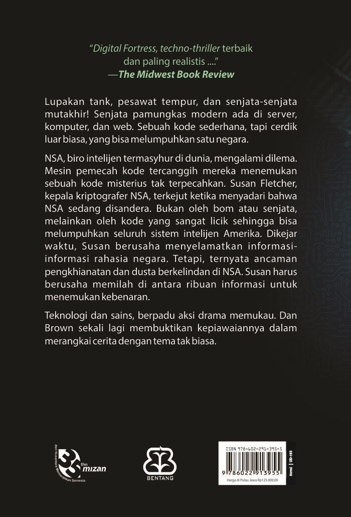 Lupakan tank, pesawat tempur, dan senjata-senjata mutakhir! Senjata pamungkas modern ada di server, komputer, dan web. Sebuah kode sederhana, tapi cerdik luar biasa, yang bisa melumpuhkan satu negara. NSA, biro intelijen termasyhur di dunia, mengalami dilema. Mesin pemecah kode tercanggih mereka menemukan sebuah kode misterius yang tak terpecahkan. Susan Fletcher, kepala kriptografer NSA, terkejut ketika menyadari bahwa NSA sedang disandera. Bukan oleh bom atau senjata, melainkan oleh kode yang sangat licik sehingga bisa melumpuhkan seluruh sistem intelejen Amerika. Dikejar waktu, Susan berusaha menyelamatkan informasi-informasi rahasia negara. Tetapi, ternyata ancaman pengkhianatan dan dusta berkelindan di NSA. Susan harus berusaha memilah di antara ribuan informasi untuk menemukan kebenaran. Teknologi dan sains, berpadu aksi drama memukau. Dan Brown sekali lagi membuktikan kepiawaiannya dalam merangkai cerita dengan tema tak biasa.
