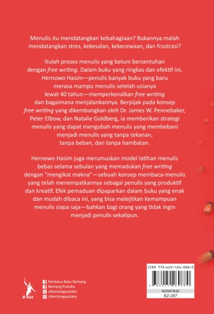 Itulah proses menulis yang belum bersentuhan dengan free writing. Dalam buku yang ringkas dan efektif ini, Hernowo Hasim—penulis banyak buku yang baru merasa mampu menulis setelah usianya lewat 40 tahun—memperkenalkan free writing dan bagaimana menjalankannya. Berpijak pada konsep free writing yang dikembangkan oleh Dr. James W. Pennebaker, Peter Elbow, dan Natalie Goldberg, ia memberikan strategi menulis yang dapat mengubah menulis yang membebani menjadi menulis yang tanpa tekanan, tanpa beban, dan tanpa hambatan.