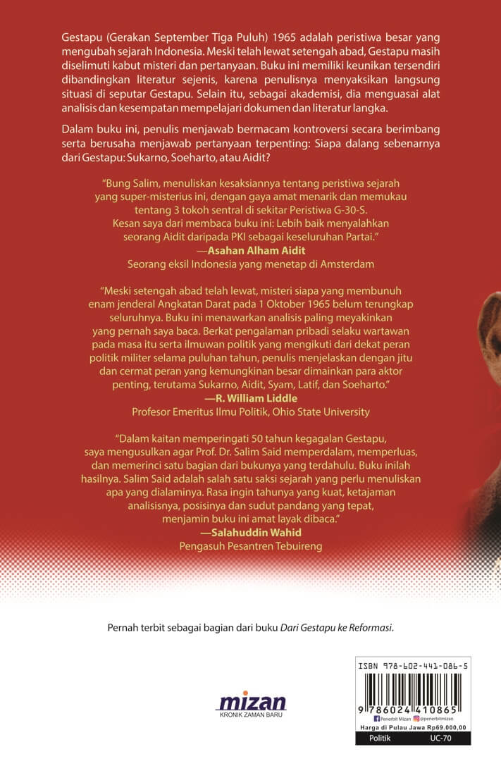 Gestapu (Gerakan September Tiga Puluh) 1965 adalah peristiwa besar yang mengubah sejarah Indonesia. Meski telah lewat setengah abad, Gestapu masih diselimuti kabut misteri dan pertanyaan. Buku ini memiliki keunikan tersendiri dibandingkan literatur sejenis, karena penulisnya menyaksikan langsung situasi di seputar Gestapu. Selain itu, sebagai akademisi, dia menguasai alat analisis dan kesempatan mempelajari dokumen dan literatur langka.