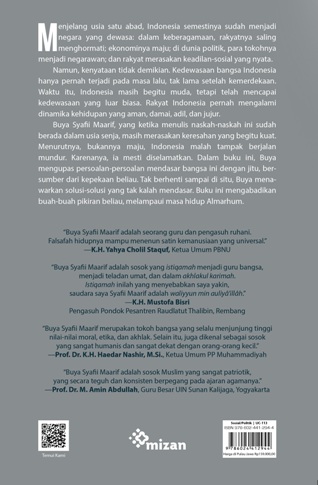 Buya Syafii Maarif, yang ketika menulis naskah-naskah ini sudah berada dalam usia senja, masih merasakan keresahan yang begitu kuat. Menurutnya, bukannya maju, Indonesia malah tampak berjalan mundur. Karenanya, ia mesti diselamatkan. Dalam buku ini, Buya mengupas persoalan-persoalan mendasar bangsa ini dengan jitu, bersumber dari kepekaan beliau. Tak berhenti sampai di situ, Buya menawarkan solusi-solusi yang tak kalah mendasar. Buku ini mengabadikan buah-buah pikiran beliau, melampaui masa hidup Almarhum.