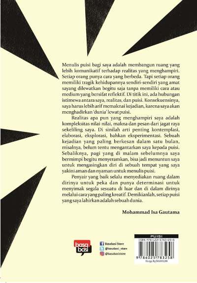 Menulis puisi bagi saya adalah membangun ruang yang lebih komunikatif terhadap realitas yang menghampiri. Setiap orang punya cara yang berbeda. Tapi setiap orang memiliki tragik kehidupannya sendiri-sendiri yang amat sayang dilewatkan begitu saja tanpa memiliki cara atau medium yang bersifat reflektif. Di titik ini, ada hubungan istimewa antara saya, realitas dan puisi. Konsekuensinya, saya harus lebih arif memaknai kejadian, karena saya akan menghadirkan '''dunia''' lewat puisi.