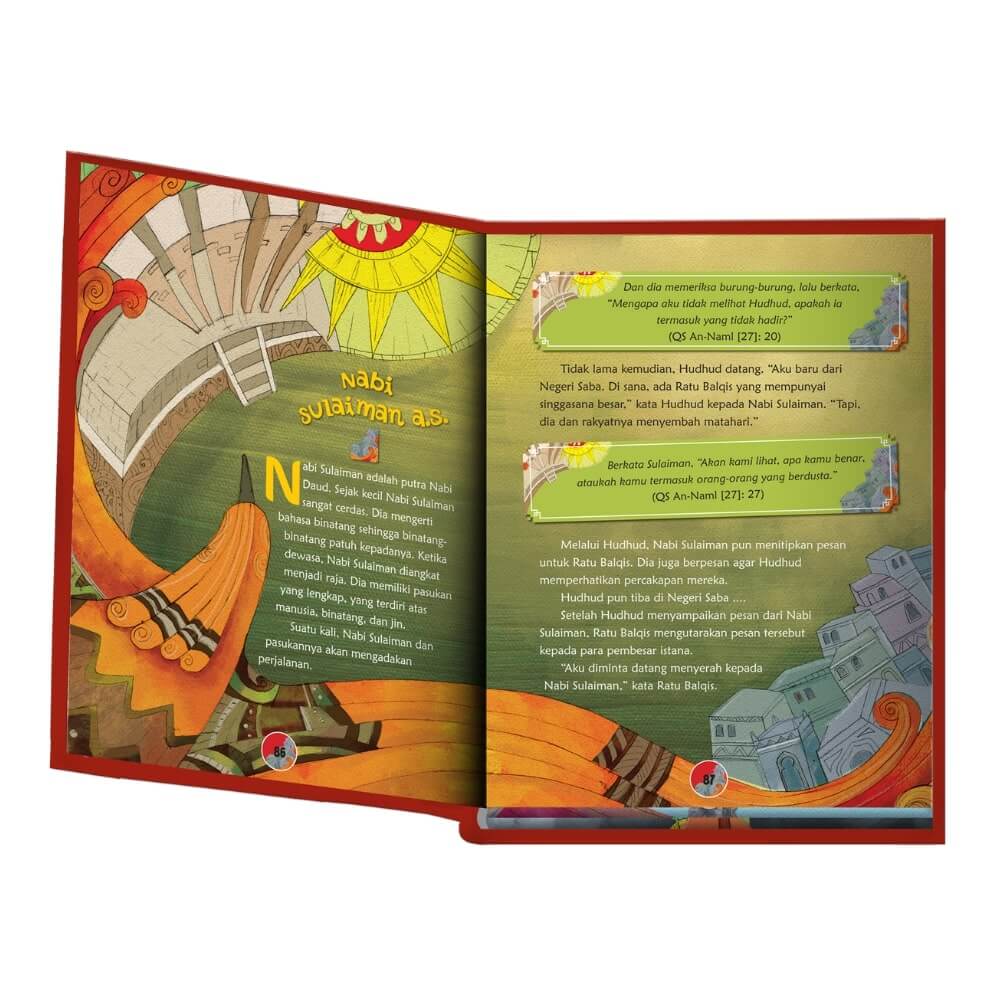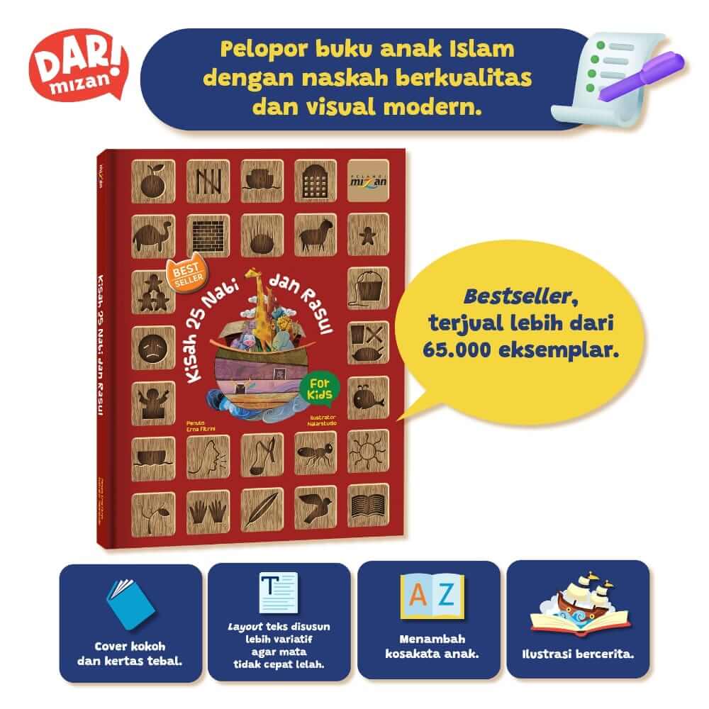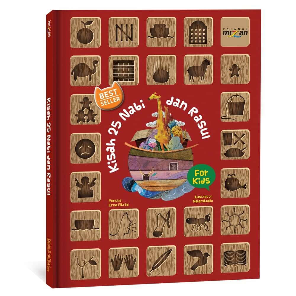 Teman-Teman, lihat susunan nama nabi di isi buku. Urutan nama nabi yang pertama hingga terakhir, sama dengan urutan gambar di sampul depan dari kiri ke kanan, kecuali kotak logo Pelangi Mizan.