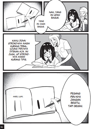 “Kurang tebal. Kok, kamu kayak takut banget menekan ujung pen-nya?” komen Myrna.