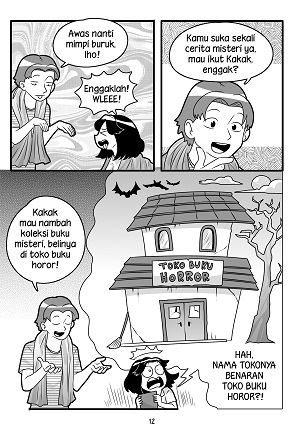 Saking sukanya membaca cerita misteri, Adik sering diam-diam meminjam novel misteri milik Kakak. Mengetahui itu, Kakak jadi semangat mengajak Adik berburu ke sebuah toko buku horor. Hm, seperti apa ya, tempatnya? Akankah mereka mengalami kejadian horor?