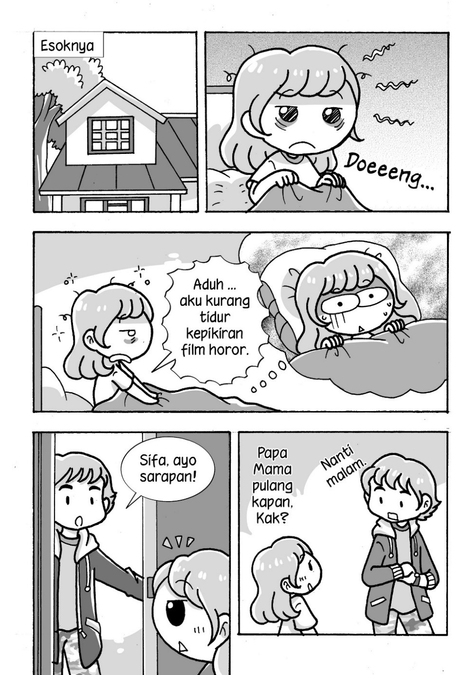 Gara-gara menonton film horor, Sifa jadi tidak bisa tidur nyenyak karena terus terbayang adegan filmnya. Sifa takut didatangi makhluk jahat di film itu. Apalagi, hari ini ia ditinggal sendirian di rumah. Mungkinkah ia akan mengalami kejadian seram seperti film yang ditontonnya …?