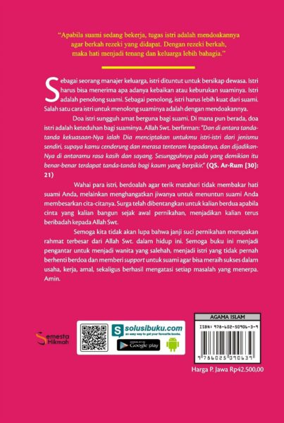 Doa istri sungguh amat berguna bagi suami. Di mana pun berada, doa istri adalah keteduhan bagi suaminya. Allah Swt. berfirman: "Dan di antara tanda-tanda kekuasaan-Nya ialah Dia menciptakan untukmu istri-istri dari jenismu sendiri, supaya kamu cenderung dan merasa tentram kepadanya, dan dijadikan-Nya di antaramu rasa kasih dan sayang. Sesungguhnya pada yang demikian itu benar-benar terdapat tanda-tanda bagi kaum yang berpikir." (QS. Ar-Rum [30]:21)