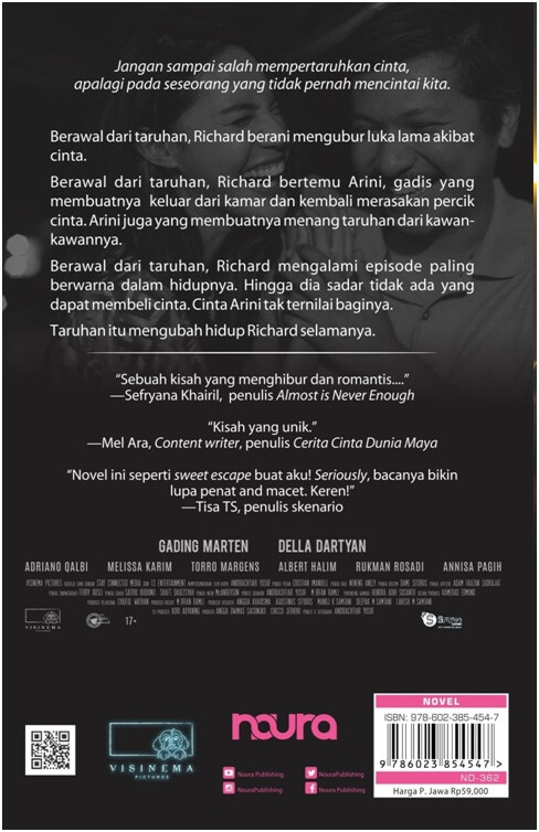 Jangan sampai salah mempertaruhkan cinta, apalagi pada seseorang yang tidak pernah mencintai kita. Berawal dari taruhan, Richard berani mengubur luka lama akibat cinta. Berawal dari taruhan, Richard bertemu Arini, gadis yang membuatnya keluar dari kamar dan kembali merasakan percik cinta. Arini juga yang membuatnya menang taruhan dari kawan-kawannya. Berawal dari taruhan, Richard mengalami episode paling berwarna dalam hidupnya. Hingga dia sadar tidak ada yang dapat membeli cinta. Cinta Arini tak ternilai baginya. Taruhan itu mengubah hidup Richard selamanya.