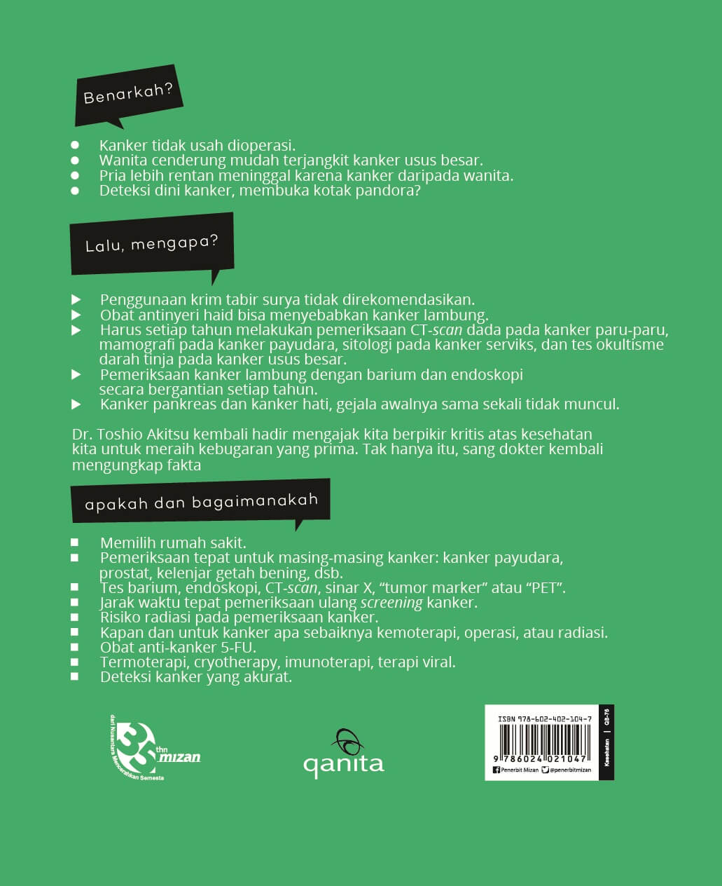 Benarkah? ^ Kanker tidak usah dioperasi. ^ Wanita cenderung mudah terjangkit kanker usus besar. ^ Pria lebih rentan meninggal karena kanker daripada wanita. ^ Deteksi dini kanker, membuka kotak pandora? Lalu, mengapa? ¢ Penggunaan krim tabir surya tidak direkomendasikan. ¢ Obat antinyeri haid bisa menyebabkan kanker lambung. ¢ Harus setiap tahun melakukan pemeriksaan CT-scan dada pada kanker paru-paru, mamografi pada kanker payudara, sitologi pada kanker serviks, dan tes okultisme darah tinja pada kanker usus besar. ¢ Pemeriksaan kanker lambung dengan barium dan endoskopi secara bergantian setiap tahun. ¢ Kanker pankreas dan kanker hati, gejala awalnya sama sekali tidak muncul. Dr. Toshio Akitsu kembali hadir mengajak kita berpikir kritis atas kesehatan kita untuk meraih kebugaran yang prima. Tak hanya itu, sang dokter kembali mengungkap fakta apakah dan bagaimanakah: ^ Memilih rumah sakit. ^ Pemeriksaan tepat untuk masing-masing kanker: kanker payudara, prostat, kelenjar getah bening, dsb. ^ Tes barium, endoskopi, CT-scan, sinar X, ^tumor marker^ atau ^PET^. ^ Jarak waktu tepat pemeriksaan ulang screening kanker. ^ Risiko radiasi pada pemeriksaan kanker. ^ Kapan dan untuk kanker apa sebaiknya kemoterapi, operasi, atau radiasi. ^ Obat anti-kanker 5-FU ^ Termoterapi, cryotherapy, imunoterapi, terapi viral. ^ Deteksi kanker yang akurat.