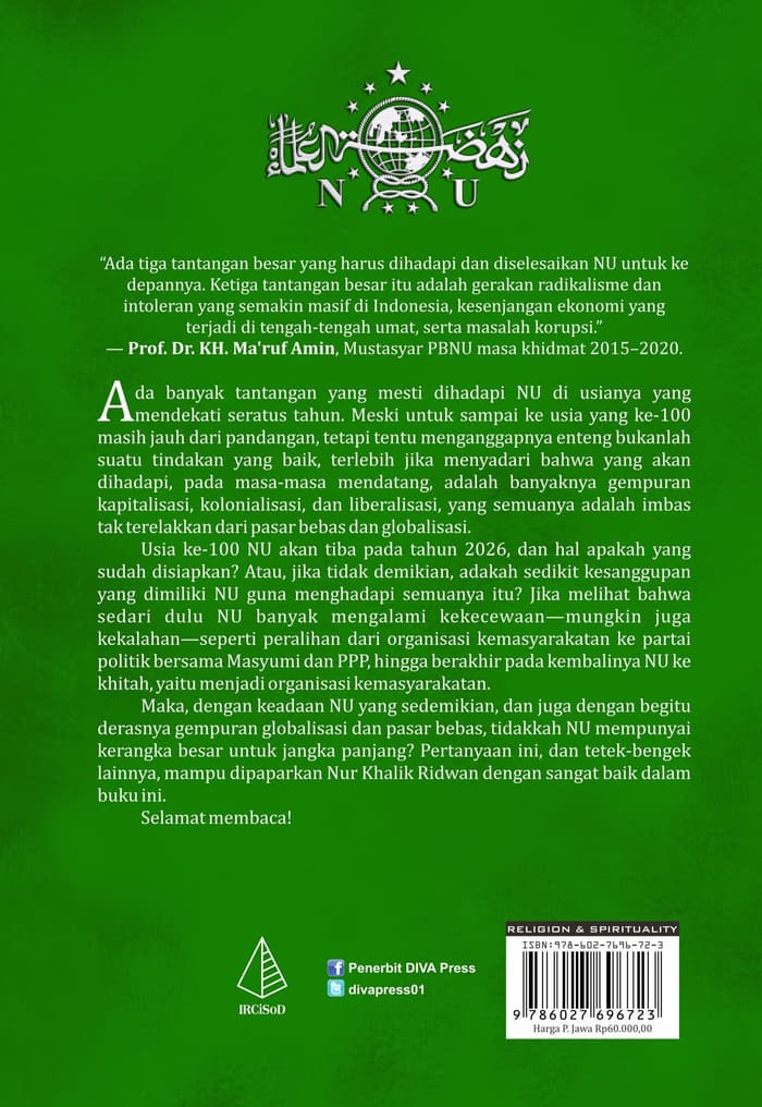Maka, dengan keadaan NU yang sedemikian, dan juga dengan begitu derasnya gempuran globalisasi dan pasar bebas, tidakkah NU mempunyai kerangka besar untuk jangka panjang? Pertanyaan ini, dan tetek-bengek lainnya, mampu dipaparkan Nur Khalik Ridwan dengan sangat baik dalam buku ini.