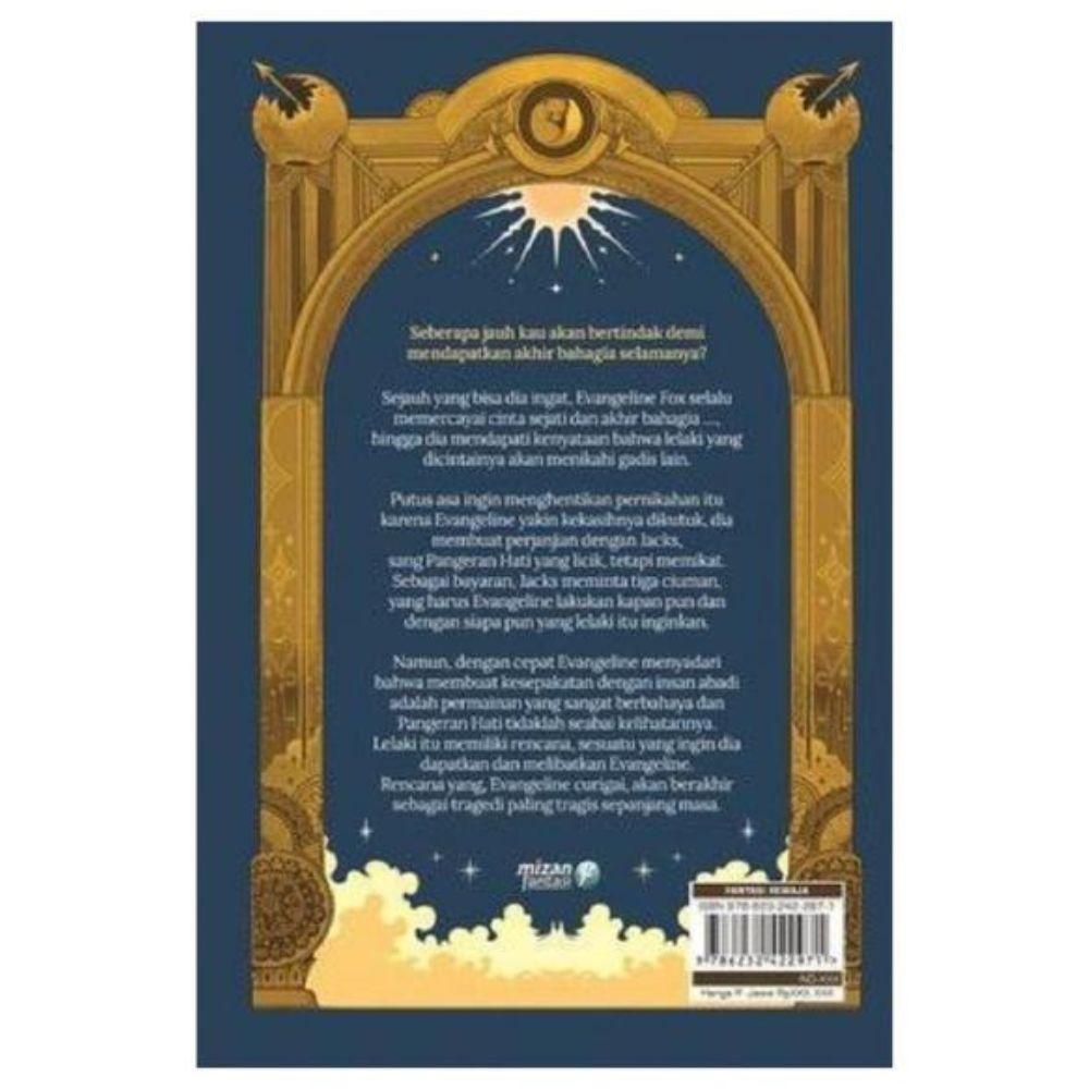 Jacks hidup abadi dengan kutukan mengerikan: siapa pun yang menciumnya akan mati. Dan, kini Evangeline berutang kepadanya. Tiga ciuman. Kapan pun lelaki itu inginkan. Dengan siapa pun yang lelaki itu tentukan. Yang tentu saja tidak sesederhana kedengarannya karena segala hal terkait Pangeran Hati, selalu melibatkan hati yang patah atau jasad yang mati.