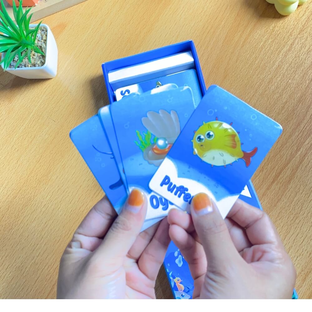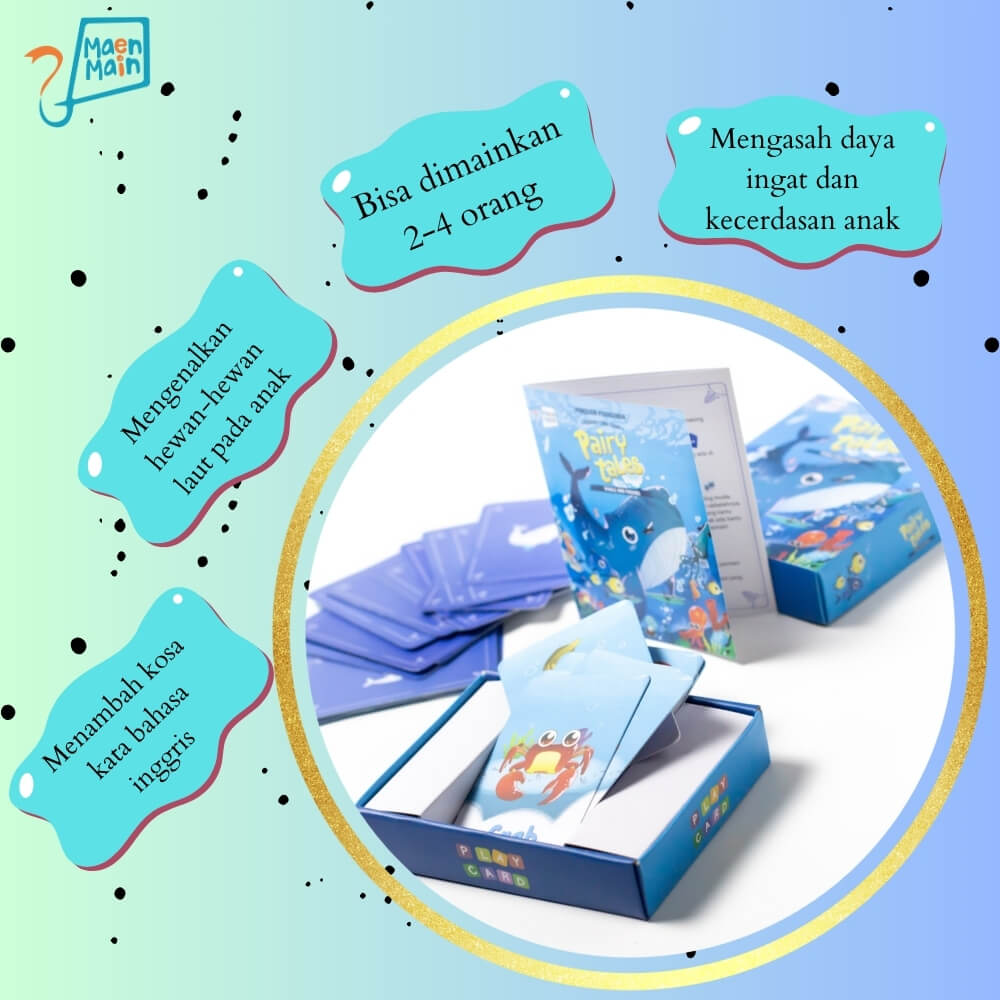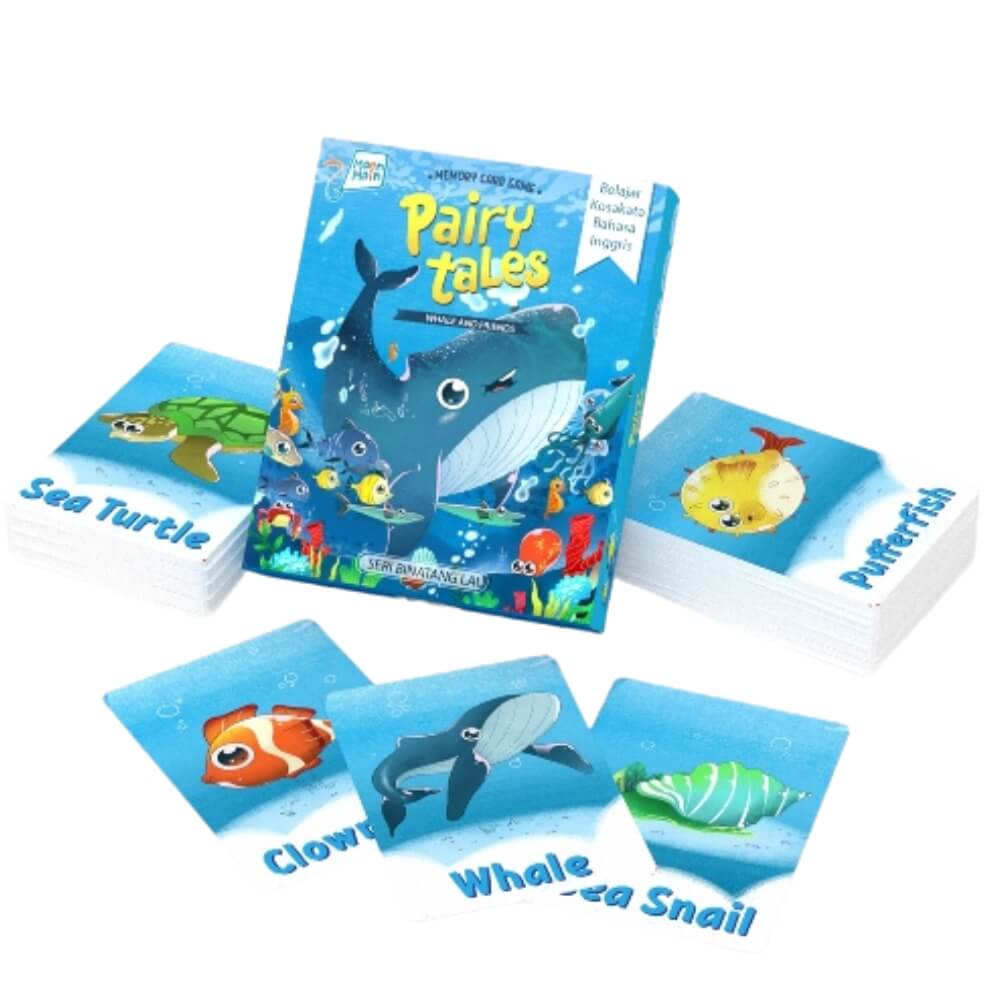 Kartu permainan mengenalkan hewan-hewan laut pada anak. Dilengkapi games untuk mengasah daya ingat dan kecerdasan anak.