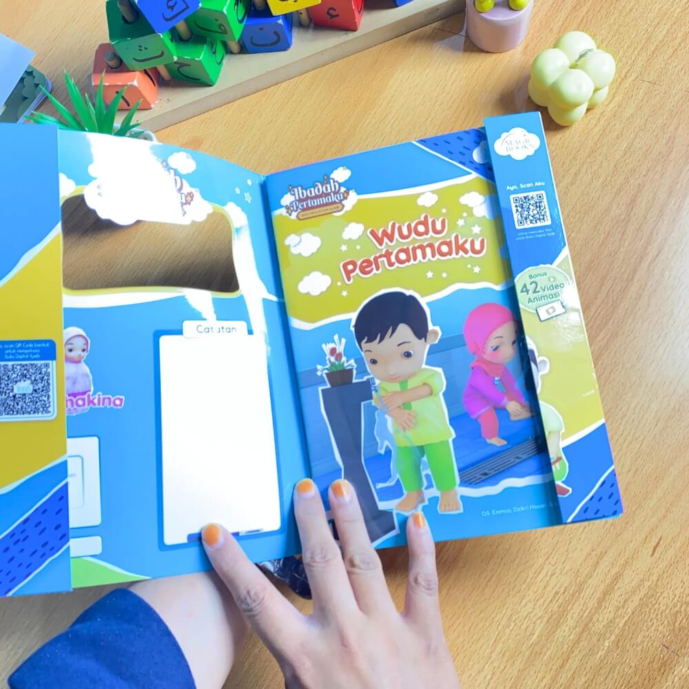 Buku ini dilengkapi dengan fitur flipbook dan animasi yang dapat membantu pembelajaran ibadah pertamanya dengan lebih mudah.