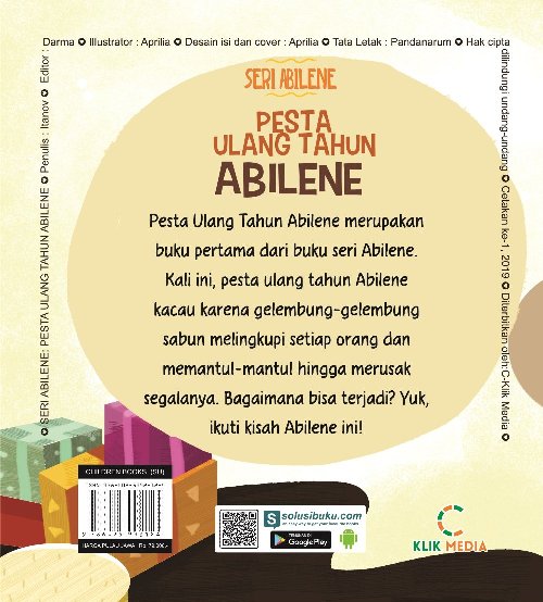 Pesta ulang tahun Abilene merupakan buku pertama dari buku seri Abilene. Kali ini, pesta ulang tahun Abilene kacau karena gelembung-gelembung sabun melingkupi setiap orang dan memantul-mantul hingga merusak segalanya. Bagaimana bisa terjadi? Yuk, ikuti kisa Abilene ini!