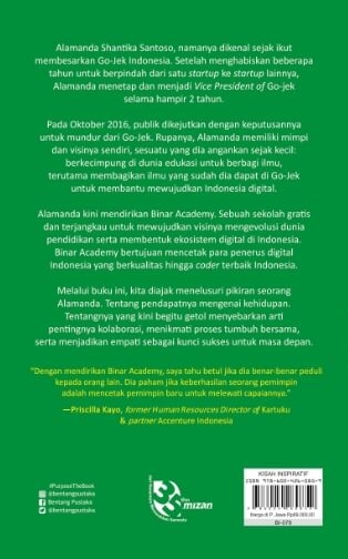 - Pada buku ini Alamanda menuturkan sebab ia keluar dari perusahaan yang membesarkan namanya, apa yang membuatnya mendirikan Binar Academy sebagai sekolah gratis untuk mencetak programer terbaik dan berkelas untuk Indonesia.