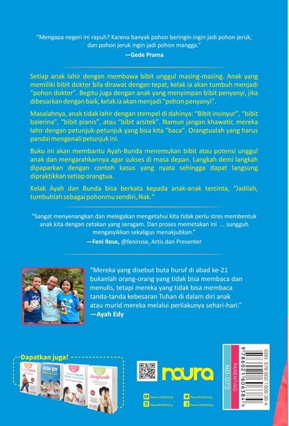 Buku ini akan membantu Ayah-Bunda menemukan bibit atau potensi unggul anak dan mengarahkannya agar sukses di masa depan. Langkah demi langkah dipaparkan dengan contoh kasus yang nyata sehingga dapat langsung dipraktikkan setiap orangtua. Kelak Ayah dan Bunda bisa berkata kepada anak-anak tercinta, “Jadilah, tumbuhlah sebagai pohonmu sendiri, Nak.”Spesifikasi