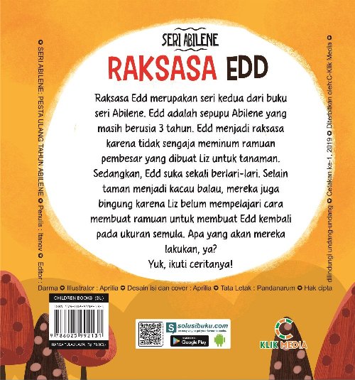 Raksasa Edd merupakan seri kedua dari buku seri Abilene. Edd adalah sepupu Abilene yang masih berusia 3 tahun. Edd menjadi raksasa karena tidak sengaja meminum ramuan pembesar yang dibuat Liz untuk tanaman. Sedangkan, Edd suka sekali berlari-lari. Selain taman menjadi kacau balau, mereka juga bingung karena Liz belum mempelajari cara membuat ramuan untuk membuat Edd kembali pada ukuran semula. Apa yang akan mereka lakukan, ya? Yuk, ikuti ceritanya!