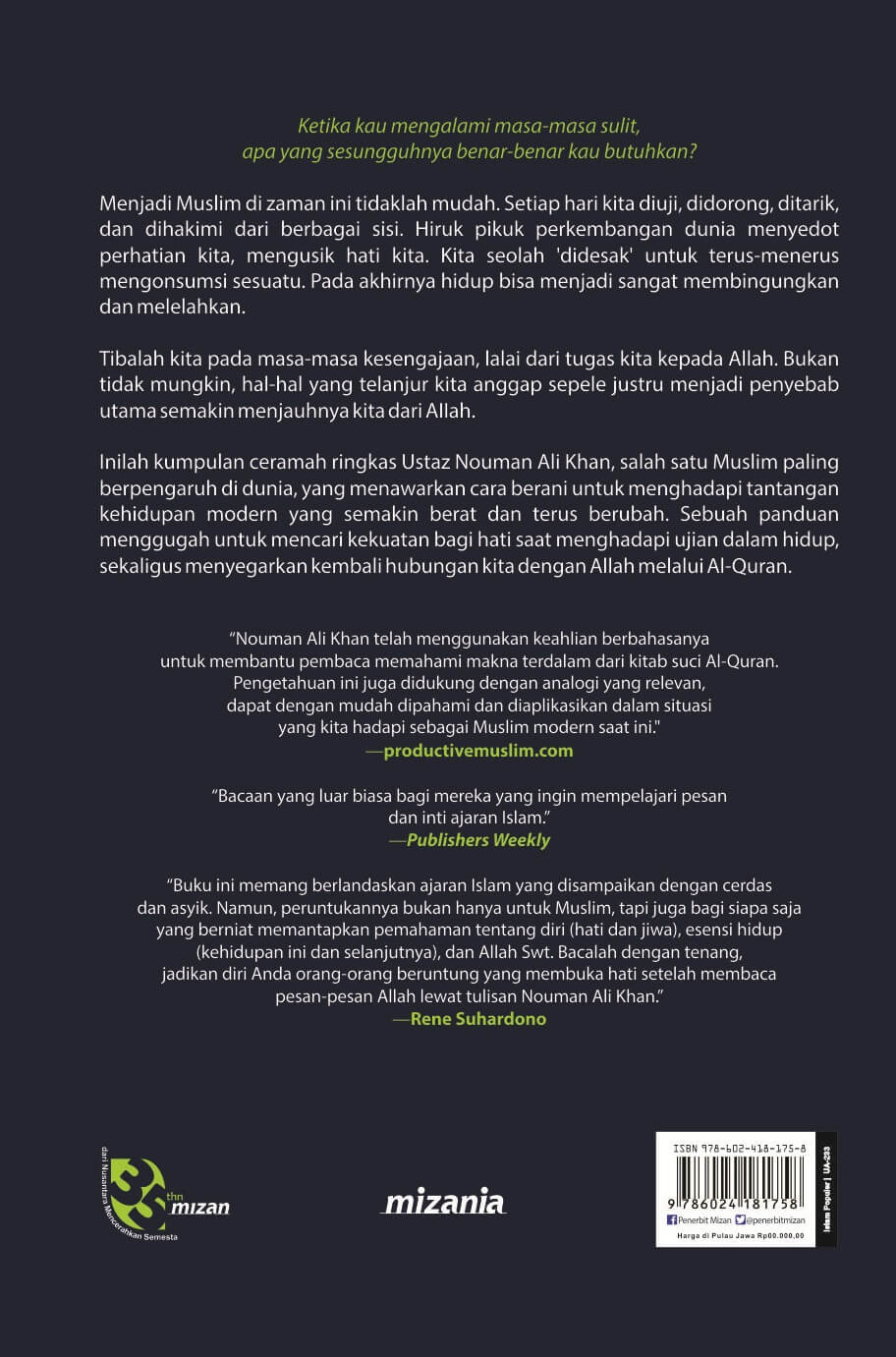 Dunia masa kini hiruk-pikuk oleh aktivitas yang tak henti-hentinya. Perkembangan dunia politik, ekonomi, media sosial, hiburan, teknologi dan lainnya, secara konstan menyedot perhatian kita. Namun lebih penting lagi, semua itu berlomba-lomba mengusik hati kita. Sesuai ideologi pasar bebas yang tanpa batas, kita terus-menerus 'didesak' untuk mengonsumsi sesuatu. Mungkin inilah saat paling cocok untuk firman Allah, alhakumut takatsur (At-Takatsur 102:1). Tibalah kita pada masa-masa kesengajaan lalai dari tugas kita kepada Allah. Tak diragukan lagi industri hiburan adalah salah satu industri modern yang paling menonjol. Dengan distraksi dan krisis yang sedemikian tinggi, betapa sulitnya tetap berfokus pada spiritual. Kumpulan ceramah Ustad Nouman Ali Khan merupakan sumbangsih penting di masa serba sulit fokus ini. Ceramah Ustad Nouman langsung tertuju ke hati, mendorong kita agar memedulikan tugas kepada Allah, mendesak kita untuk membenahi perspektif hidup. Budaya masa kini meminta kita memikirkan maut sebagai akhir yang final atas keberadaan hedonis, sedangkan din kita mengajarkan bahwa maut hanyalah awal kehidupan kita yang sesungguhnya.