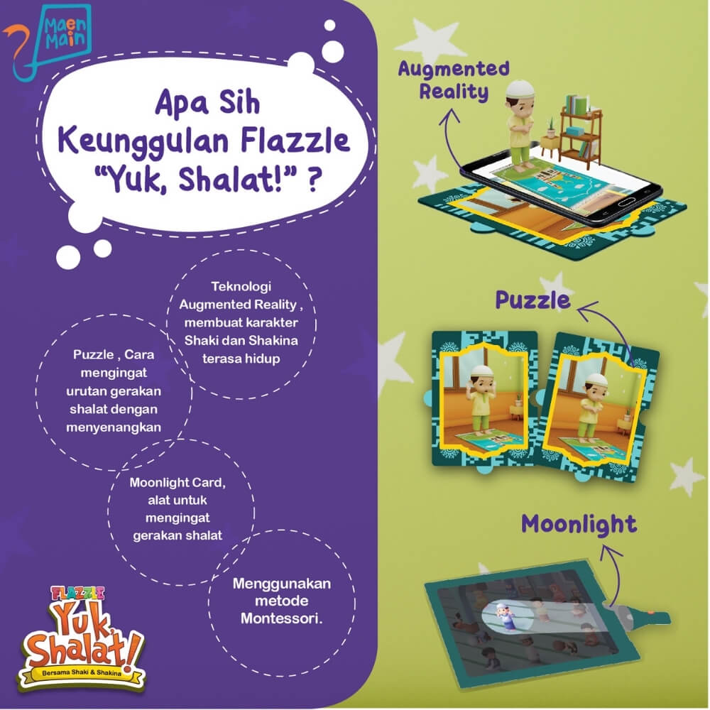 Media pembelajaran Shalat untuk anak Termudah dan Terlengkap di Indonesia. Menggabungkan media pembelajaran Flashcard, Puzzle, dan Teknologi Augmented Reality. Cocok dengan segala gaya belajar anak; Kinestetik, Visual, dan Audiotory. Flazzle : Yuk, Shalat! Bersama Shaki ini cocok digunakan oleh anak laki-laki.