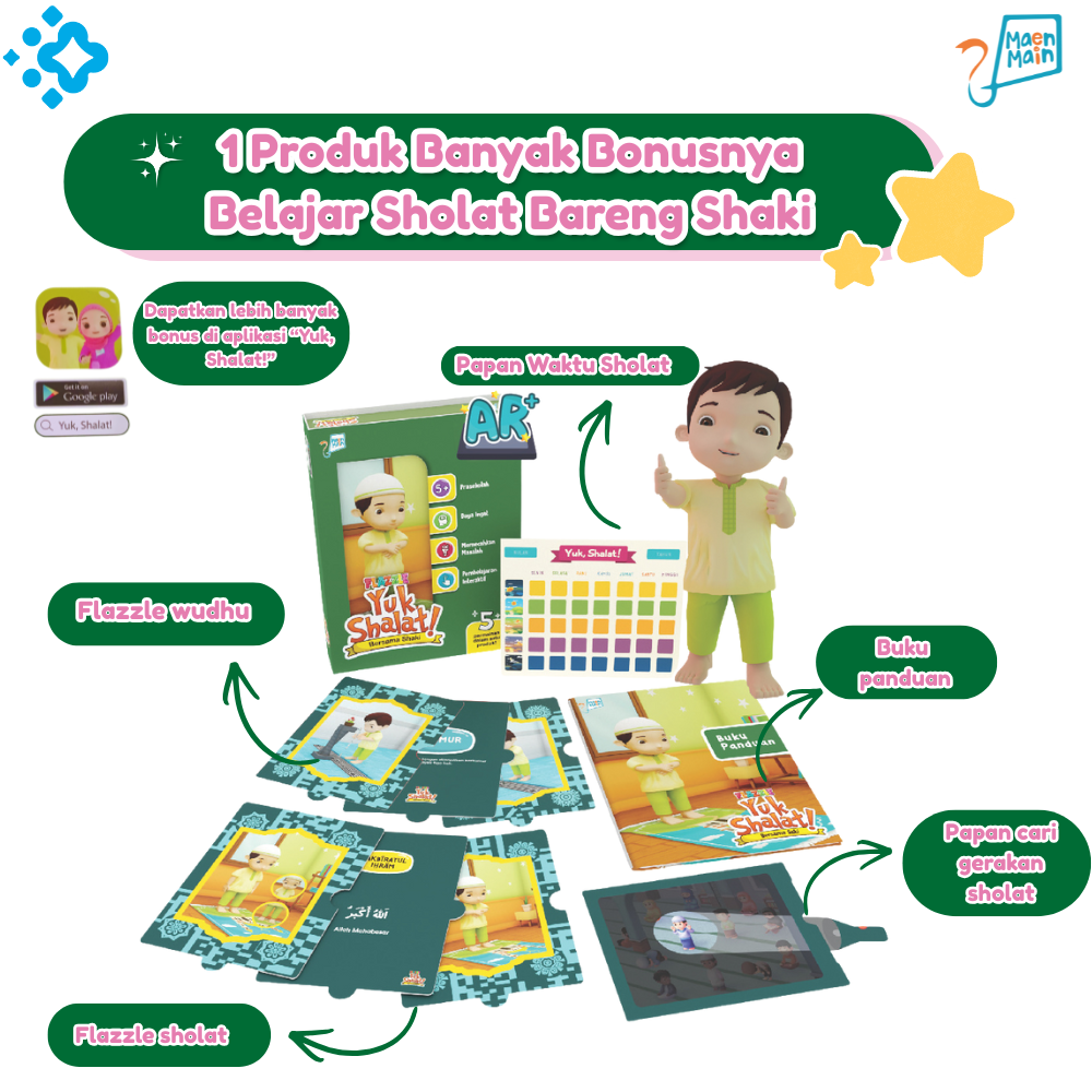 Terbagi dalam 2 seri, seri Flazzle Yuk Shalat bersama Shaki untuk anak laki-laki dan Flazzle Yuk Shalat bersama Shakina untuk anak perempuan. Bentuk produk Flash Card dan juga permainan Puzzle akan mengajak anak mengenal dan belajar shalat dengan lebih cepat dan juga menyenangkan. Selain itu, anak bisa bermain sambil belajar bagaimana shalat yang benar dari mulai belajar wudhu (beserta urutan gerakannya), doa sebelum dan setelah wudhu, niat untuk shalat, dan gerakan juga bacaan ketika shalat.