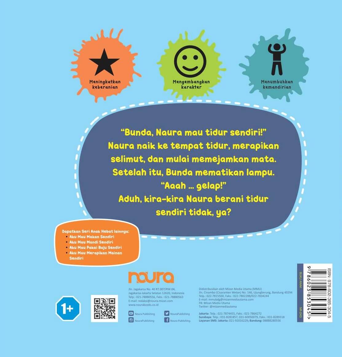 “Bunda, Naura mau tidur sendiri!” Naura naik ke tempat tidur, merapikan selimut, dan mulai memejamkan mata. Setelah itu, Bunda mematikan lampu. “Aaah ... gelap!” Aduh, kira-kira Naura berani tidur sendiri tidak, ya?