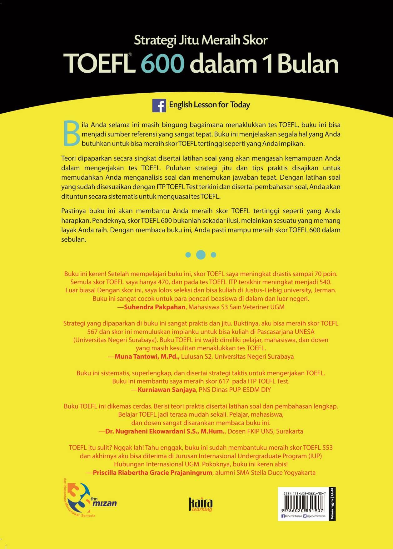 Bila Anda selama ini masih bingung bagaimana menaklukkan tes TOEFL, buku ini bisa menjadi sumber referensi yang sangat tepat. Buku ini menjelaskan segala hal yang Anda butuhkan untuk bisa meraih skor TOEFL tertinggi seperti yang Anda impikan. Teori dipaparkan secara singkat disertai latihan soal yang akan mengasah kemampuan Anda dalam mengerjakan tes TOEFL. Puluhan strategi jitu dan tips praktis disajikan untuk memudahkan Anda menganalisa soal dan menemukan jawaban tepat. Dengan latihan soal yang sudah disesuaikan dengan ITP TOEFL Test terkini dan disertai pembahasan soal, Anda akan dituntun secara sistematis untuk menguasai tes TOEFL. Pastinya buku ini akan membantu Anda meraih skor TOEFL tertinggi seperti yang Anda harapkan. Pendeknya, skor TOEFL 600 bukanlah sekedar ilusi namun sesuatu yang memang layak Anda raih. Dengan membaca buku ini, Anda pasti mampu meraih skor TOEFL 600 dalam sebulan.