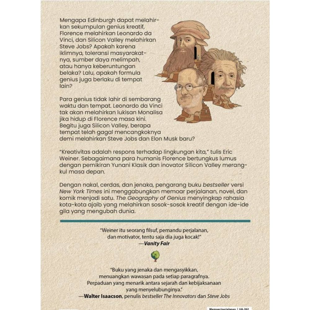 Mengapa Edinburgh dapat melahirkan sekumpulan genius kreatif, Florence melahirkan Leonardo da Vinci, dan Silicon Valley melahirkan Steve Jobs? Apakah karena iklimnya, toleransi masyarakatnya, sumber daya melimpah, atau hanya keberuntungan belaka? Lalu, apakah formula genius juga berlaku di tempat lain?