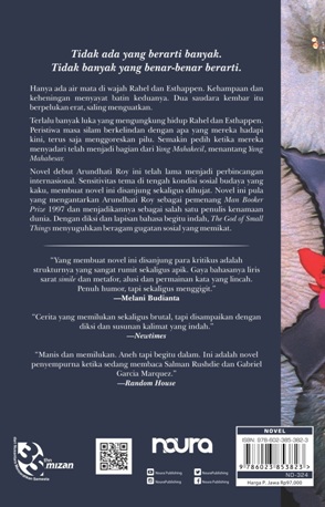Novel debut Arundhati Roy ini telah lama menjadi perbincangan internasional. Sensitivitas tema di tengah kondisi sosial budaya yang kaku, membuat novel ini disanjung sekaligus dihujat. Novel ini pula yang mengantarkan Arundhati Roy sebagai pemenang Man Booker Prize 1997 dan menjadikannya sebagai salah satu penulis kenamaan dunia. Dengan diksi dan lapisan bahasa begitu indah, The God of Small Things menyuguhkan beragam gugatan sosial yang memikat.