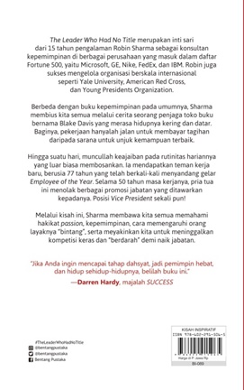 The Leader Who Had No Title merupakan inti sari dari 15 tahun pengalaman Robin Sharma sebagai konsultan kepemimpinan di berbagai perusahaan yang masuk dalam daftar Fortune 500, yaitu Microsoft, GE, Nike, FedEx, dan IBM. Robin juga sukses mengelola organisasi berskala internasional seperti Yale University, American Red Cross, dan Young Presidents Organization.