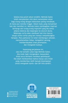 Selama dua puluh tahun terakhir, Melinda Gates telah menjalankan misi demi menemukan solusi bagi orang-orang dengan kebutuhan paling mendesak, di mana pun mereka tinggal. Dalam buku yang menyentuh hati dan memikat ini, Melinda Gates membagikan inspirasi berharga dari orang-orang inspiratif yang dia temui selama bekerja dan bepergian ke seluruh dunia. Beberapa cerita akan membuat hati kita hancur, tetapi cerita-cerita yang lain mampu melambungkan harapan. Para pahlawan ini telah membangun sekolah, menyelamatkan hidup, mengakhiri perang, memberdayakan anak perempuan, dan mengubah budaya.
