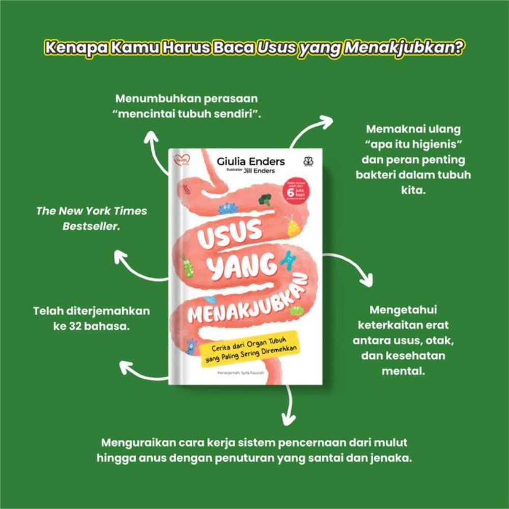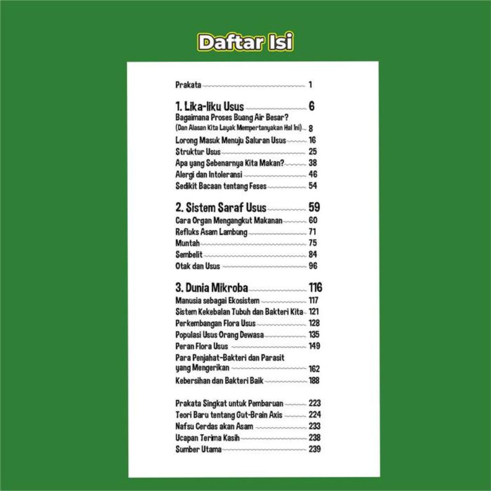 Buku ini akan menjadikan saluran pencernaan kita sebagai bintang utama. Giulia Enders—ilmuwan Jerman lulusan program doktoral (M.D.) di bidang Gastroenterologi, Goethe University, Frankfurt—menjelaskan keajaiban usus dan menjawab pertanyaan seperti: