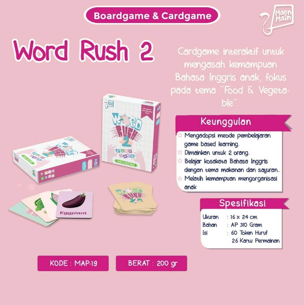 Bermain dan belajar akan semakin menyenangkan dengan "Word Rush 2", anak akan belajar kosakata bahasa Inggris, tentang makanan dan sayuran, dengan bermain "Word Rush 2" juga akan melatih ketangkasan anak dan melatih kemampuan mengorganisirnya.