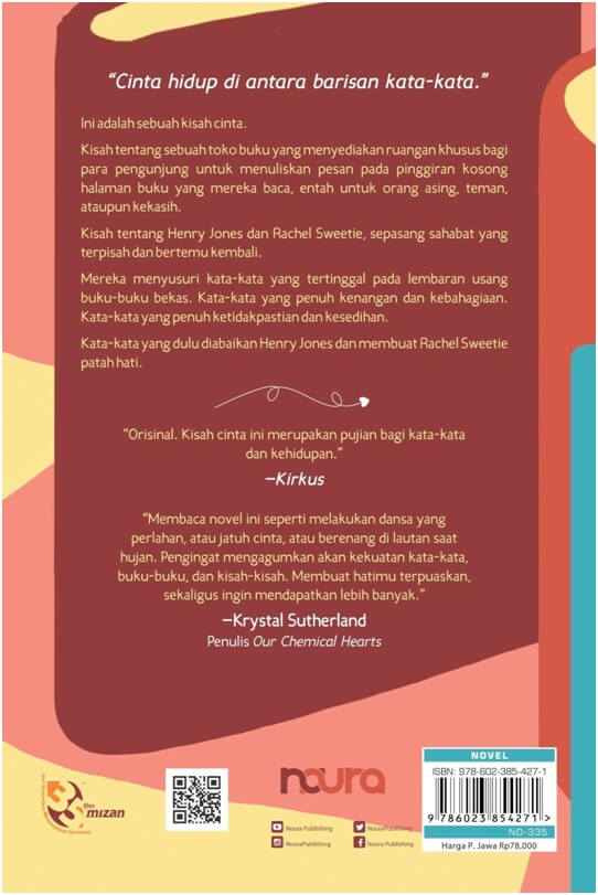 Kisah tentang sebuah toko buku yang menyediakan ruangan khusus bagi para pengunjung untuk menuliskan pesan pada pinggiran kosong halaman buku yang mereka baca, entah untuk orang asing, teman, ataupun kekasih. Kisah tentang Henry Jones dan Rachel Sweetie, sepasang sahabat yang terpisah dan bertemu kembali. Mereka menyusuri kata-kata yang tertinggal pada lembaran usang buku-buku bekas. Kata-kata yang penuh kenangan dan kebahagiaan. Kata-kata yang penuh ketidakpastian dan kesedihan.