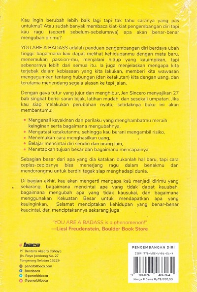 YOU ARE A BADASS adalah panduan pengembangan diri berdaya ubah tinggi: bagaimana kau dapat melihat kehidupanmu dengan mata baru, menemukan passionmu, menjalani hidup yang kau impikan, tapi sebenarnya lebih dari semua itu.